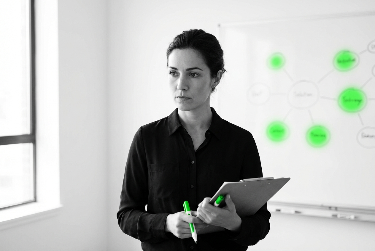 Professional with clipboard and strategy diagram